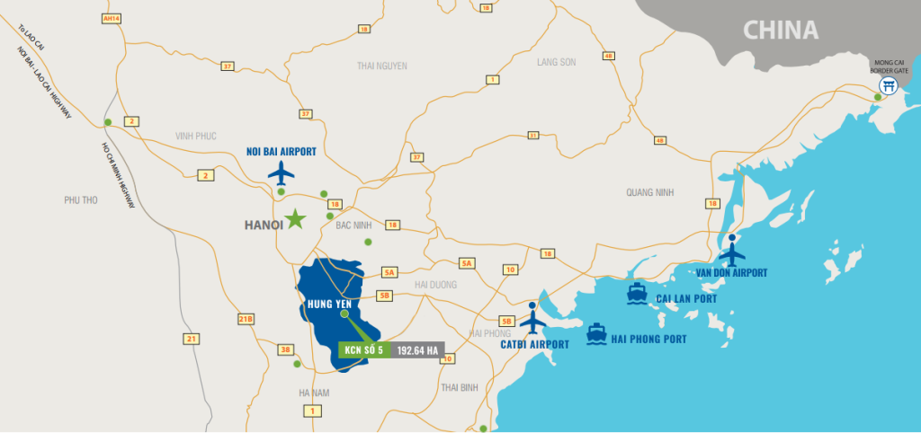 - Khu công nghiệp số 5 nằm ở vị trí đắc địa trên trục đường nối 2 cao tốc Hà Nội – Hải Phòng và Pháp Vân- Cầu Giẽ, cách Nút giao Yên Mỹ 4 Km.